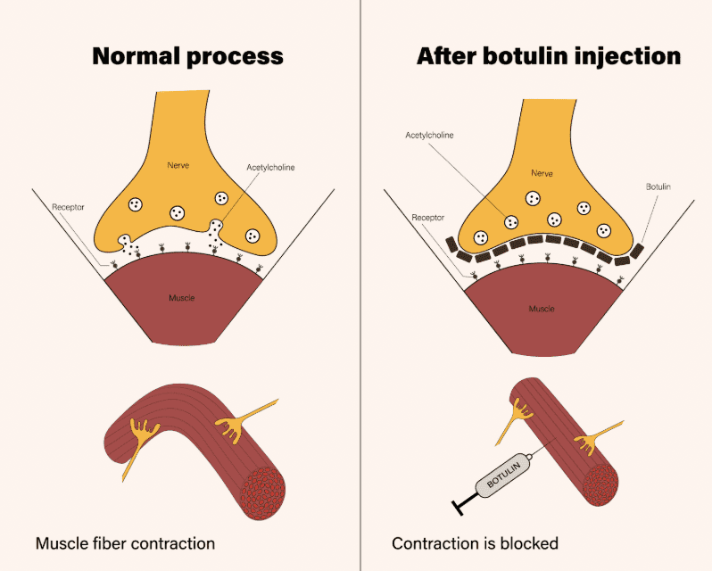 Botox (botuline toxine type A) blokkeert tijdelijk de signaaloverdracht tussen zenuw en spier.